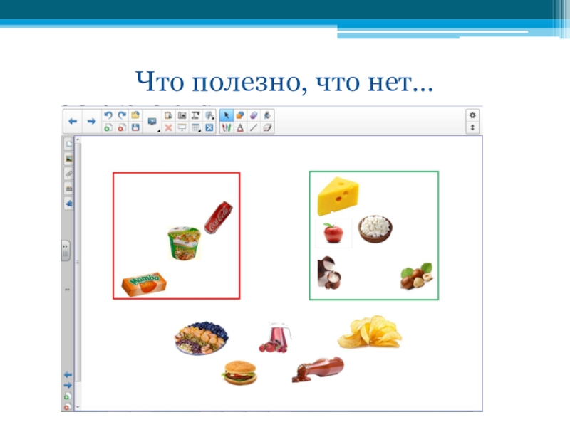 6. «Что полезно, а что нет». На интерактивной доске даны изображения различных продуктов. Полезные кладутся на зеленый фон, не полезные – на красный.