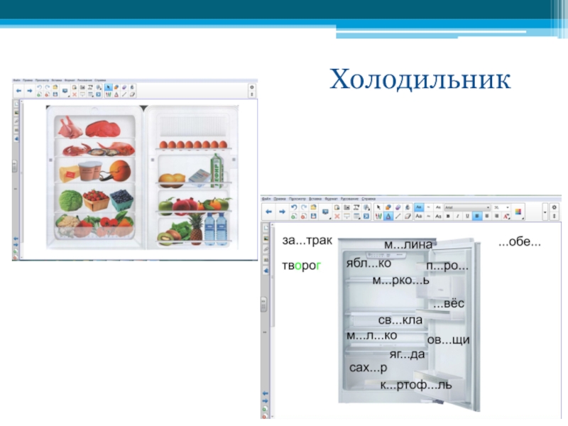 7. «Холодильник». На интерактивной доске картинки с изображением продуктов питания. Ребенок встает с места и говорит «Сегодня в моем холодильнике есть…» и перечисляет продукты, которые изображены на картинках. Затем озвучивает свой выбор: «Я возьму на завтрак…» и перечисляет либо продукт, который полезен для организма и может являться завтраком, либо блюдо, которое можно приготовить из нескольких продуктов, находящихся в холодильнике.