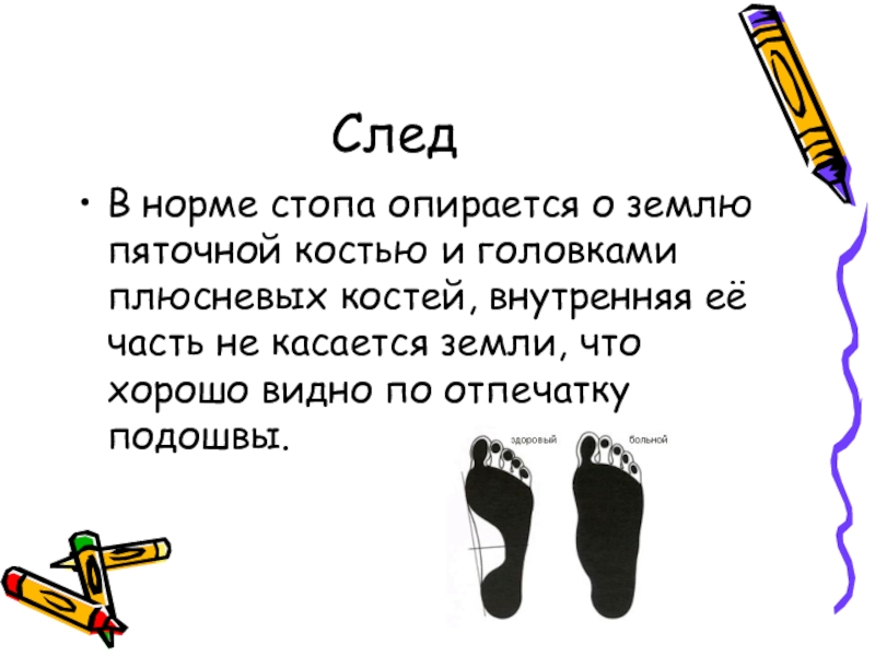 След В норме стопа опирается о землю пяточной костью и головками плюсневых костей, внутренняя её часть не