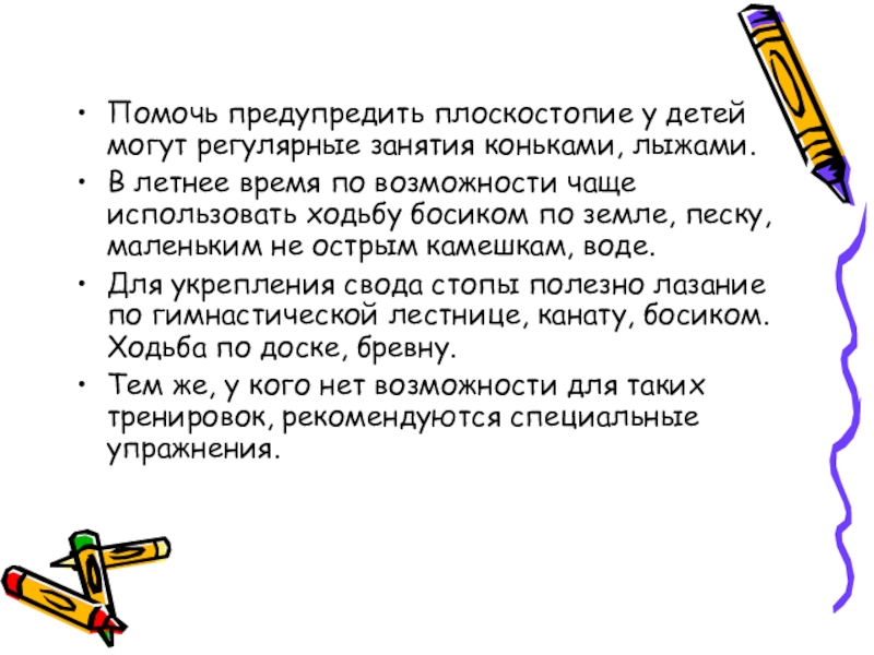 Помочь предупредить плоскостопие у детей могут регулярные занятия коньками, лыжами.В летнее время по возможности чаще использовать ходьбу