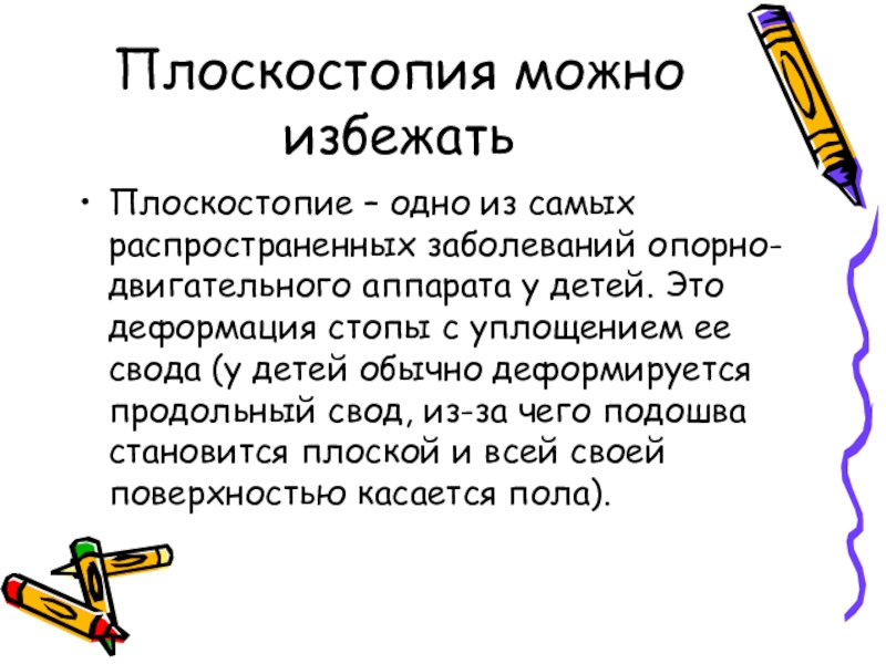 Плоскостопия можно избежатьПлоскостопие – одно из самых распространенных заболеваний опорно-двигательного аппарата у детей. Это деформация стопы с