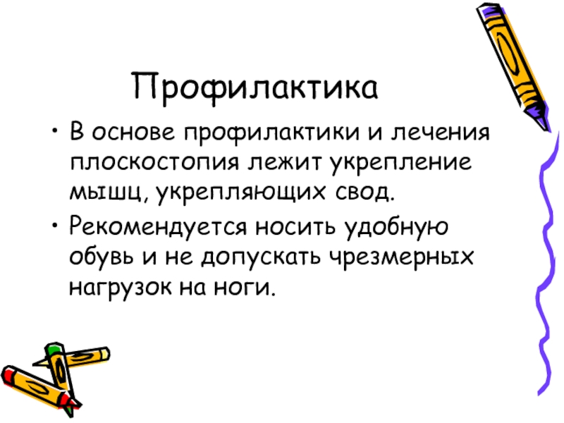 Профилактика В основе профилактики и лечения плоскостопия лежит укрепление мышц, укрепляющих свод.Рекомендуется носить удобную обувь и не