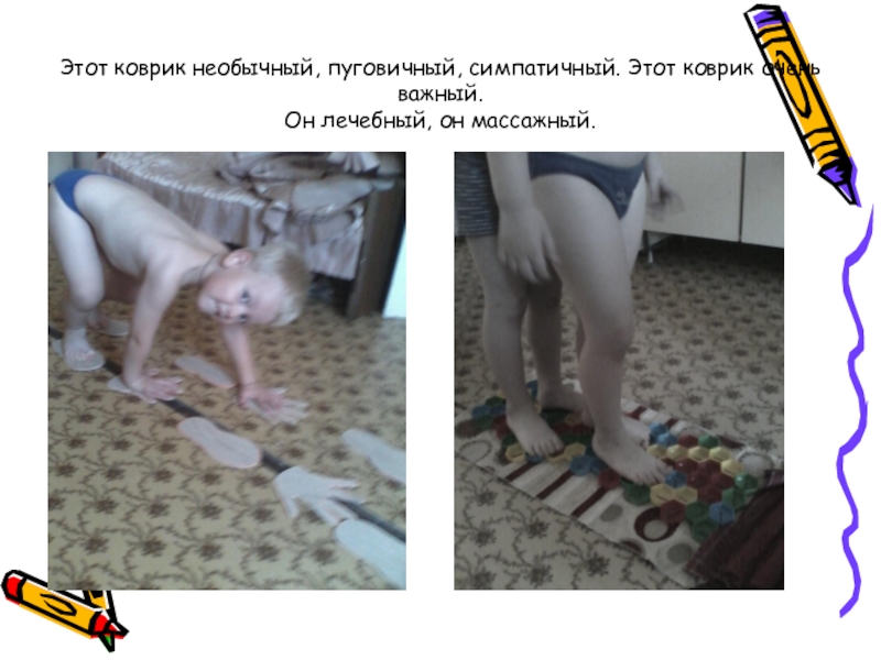 Слайд 3Этот коврик необычный, пуговичный, симпатичный. Этот коврик очень важный. Он лечебный, он