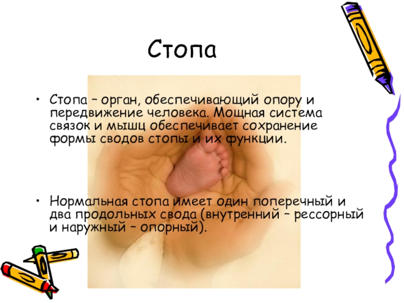 Стопа Стопа – орган, обеспечивающий опору и передвижение человека. Мощная система связок и мышц обеспечивает сохранение формы