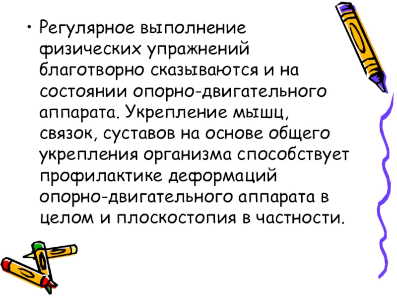 Слайд 10Регулярное выполнение физических упражнений благотворно сказываются и на состоянии опорно-двигательного аппарата.