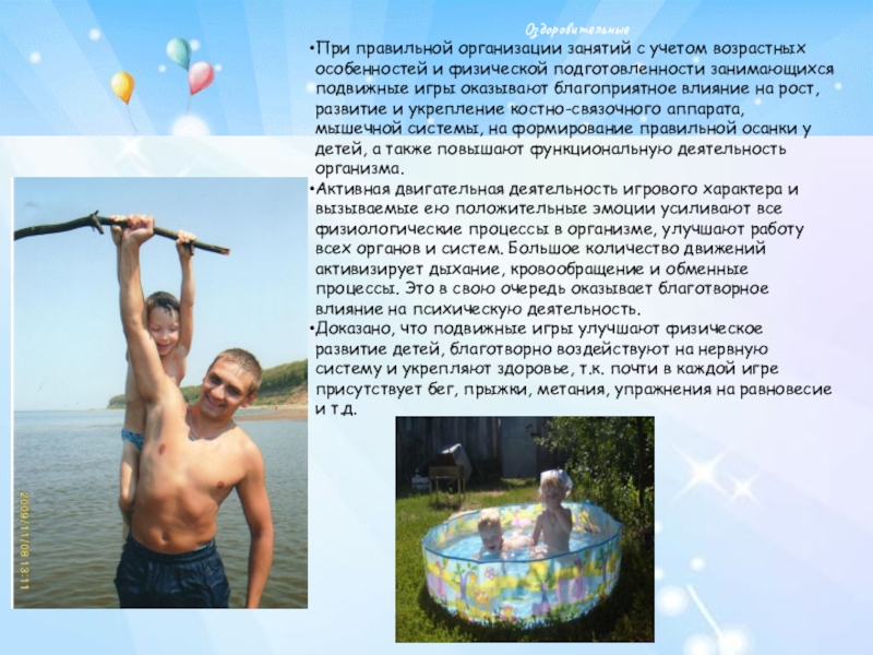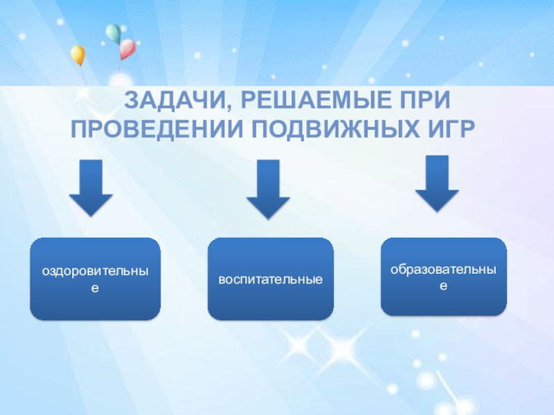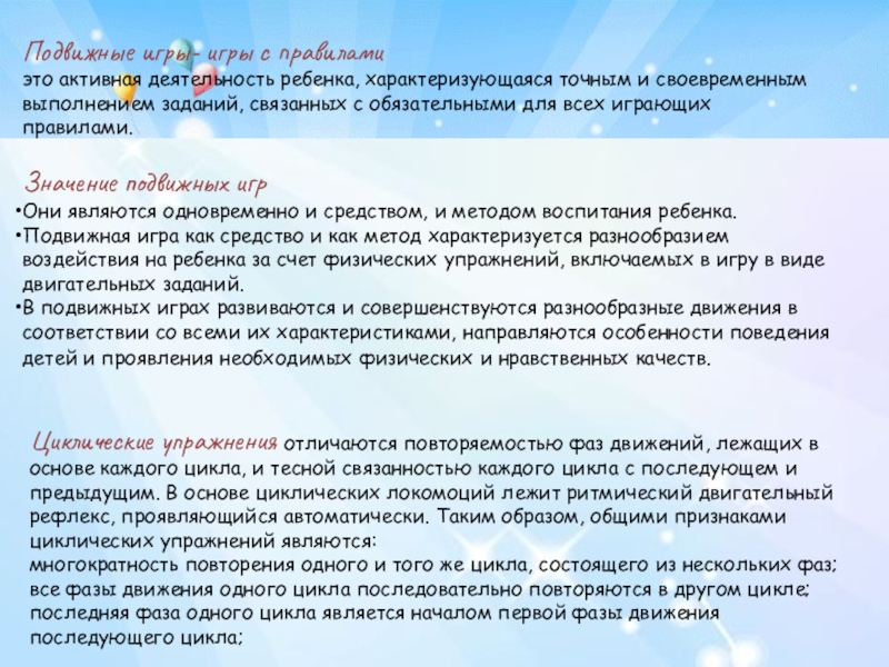 Подвижная игра как средство и как метод характеризуется разнообразием воздействия на ребенка за счет физических упражнений, включаемых в игру в виде двигательных заданий.