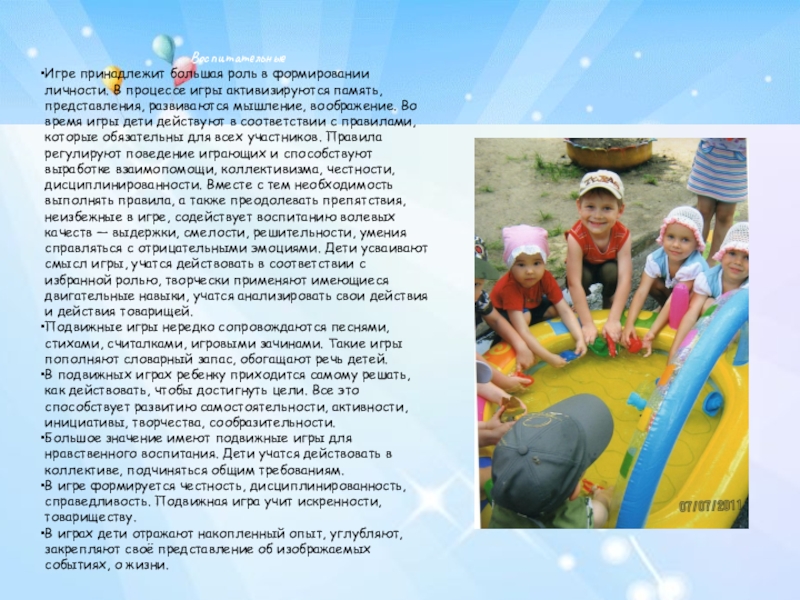 В подвижных играх развиваются и совершенствуются разнообразные движения в соответствии со всеми их характеристиками, направляются особенности поведения детей и проявления необходимых физических и нравственных качеств.