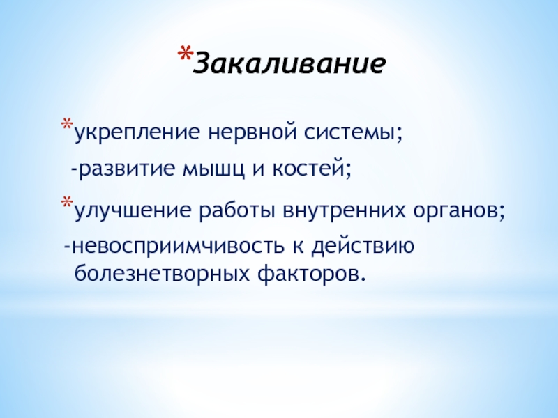Закаливаниеукрепление нервной системы; -развитие мышц и костей;улучшение работы внутренних органов;-невосприимчивость к действию болезнетворных факторов.