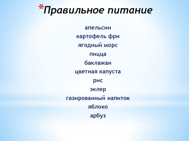 Правильное питаниеапельсинкартофель фриягодный морспиццабаклажанцветная капустарисэклергазированный напитокяблокоарбуз