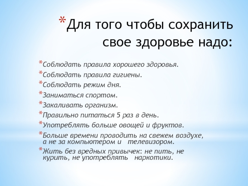 Слайд 10Для того чтобы сохранить свое здоровье надо: