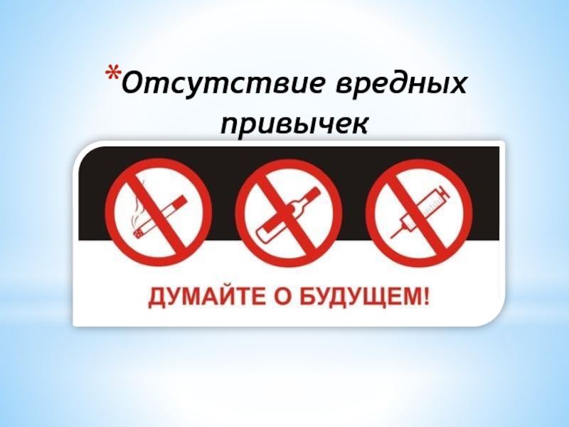 Слайд 4Отсутствие вредных привычек
