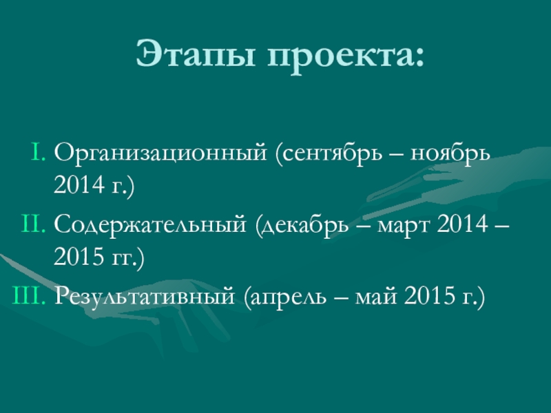 Этапы проекта:Организационный (сентябрь – ноябрь 2014 г.)Содержательный (декабрь – март 2014 – 2015 гг.)Результативный (апрель – май