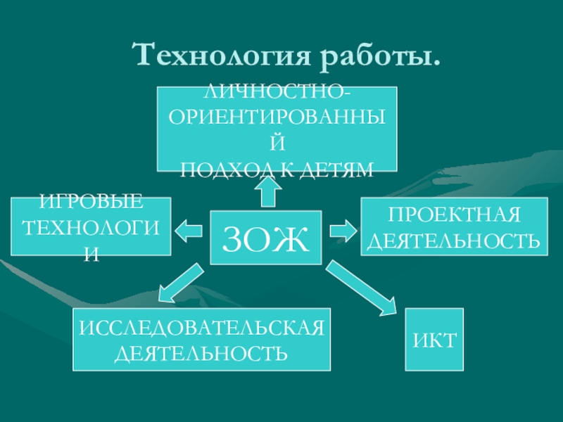 Технология работы.ЗОЖПРОЕКТНАЯ ДЕЯТЕЛЬНОСТЬИССЛЕДОВАТЕЛЬСКАЯДЕЯТЕЛЬНОСТЬИКТИГРОВЫЕ ТЕХНОЛОГИИЛИЧНОСТНО-ОРИЕНТИРОВАННЫЙПОДХОД К ДЕТЯМ
