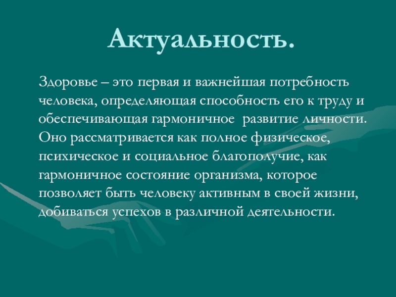 Актуальность.  Здоровье – это первая и важнейшая потребность человека, определяющая способность его к труду и обеспечивающая