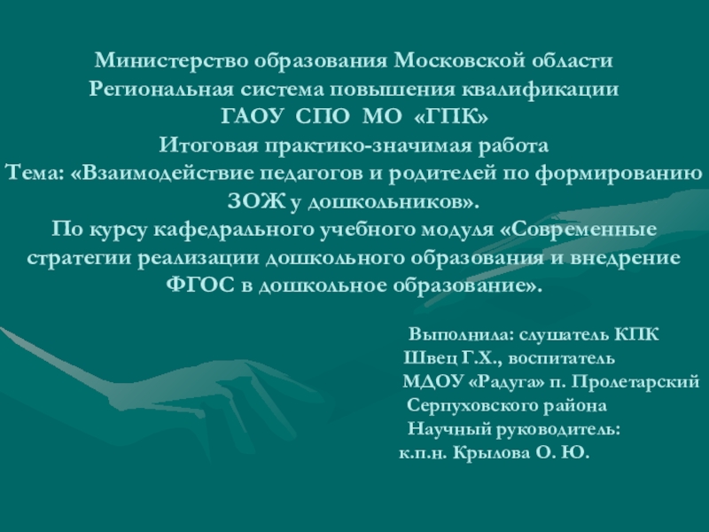 работа Тема: «Взаимодействие педагогов и родителей по формированию ЗОЖ у дошкольников». По курсу кафедрального учебного модуля «Современные стратегии реализации дошкольного образования и внедрение ФГОС в дошкольное образование». Выполнила: слушатель КПК Швец Г.Х., воспитатель МДОУ «Радуга» п. Пролетарский Серпуховского района Научный руководитель: к.п.н. Крылова О. Ю.