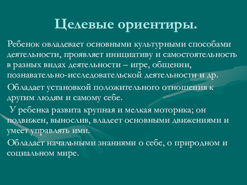 Целевые ориентиры.  Ребенок овладевает основными культурными способами деятельности, проявляет инициативу и самостоятельность в разных видах деятельности