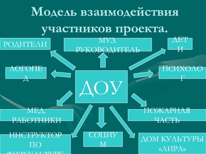 Модель взаимодействия участников проекта.ДОУРОДИТЕЛИДЕТИИНСТРУКТОР ПО ФИЗКУЛЬТУРЕПСИХОЛОГЛОГОПЕДМЕД. РАБОТНИКИСОЦИУМДОМ КУЛЬТУРЫ «ЛИРА»ПОЖАРНАЯ ЧАСТЬМУЗ. РУКОВОДИТЕЛЬ