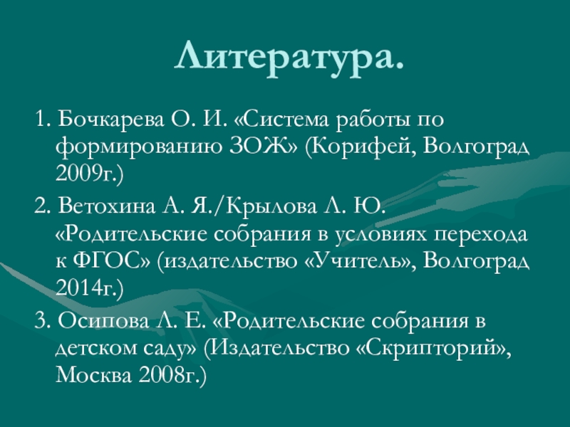 Литература.1. Бочкарева О. И. «Система работы по формированию ЗОЖ» (Корифей, Волгоград 2009г.)2. Ветохина А. Я./Крылова Л. Ю.