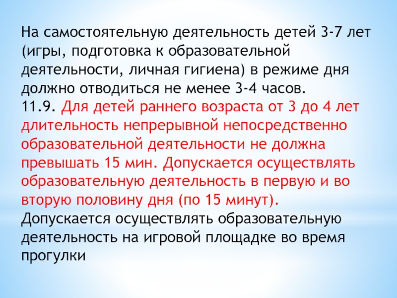 Слайд 11На самостоятельную деятельность детей 3-7 лет (игры, подготовка к образовательной деятельности,