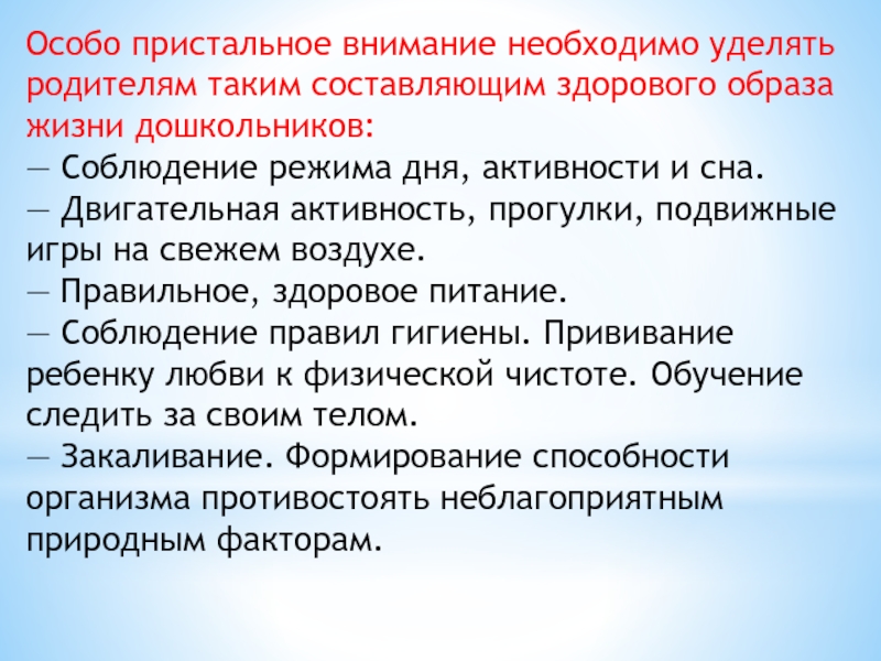 Слайд 15Особо пристальное внимание необходимо уделять родителям таким составляющим здорового образа жизни
