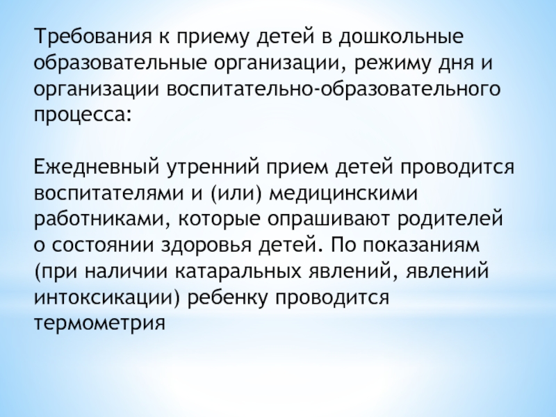 Ежедневный утренний прием детей проводится воспитателями и (или) медицинскими работниками, которые опрашивают родителей о состоянии здоровья детей. По показаниям (при наличии катаральных явлений, явлений интоксикации) ребенку проводится термометрия