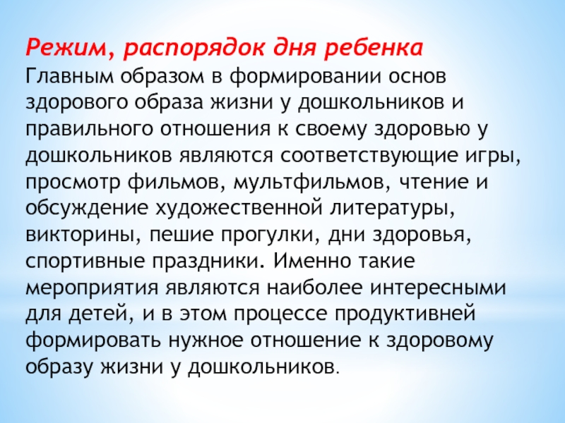 у дошкольников и правильного отношения к своему здоровью у дошкольников являются соответствующие игры, просмотр фильмов, мультфильмов, чтение и обсуждение художественной литературы, викторины, пешие прогулки, дни здоровья, спортивные праздники. Именно такие мероприятия являются наиболее интересными для детей, и в этом процессе продуктивней формировать нужное отношение к здоровому образу жизни у дошкольников.