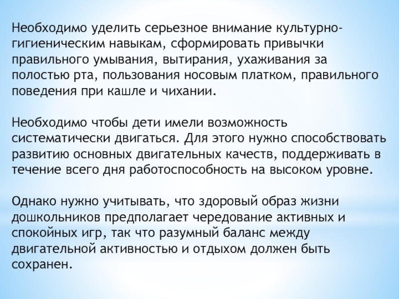Слайд 13Необходимо уделить серьезное внимание культурно-гигиеническим навыкам, сформировать привычки правильного умывания, вытирания,