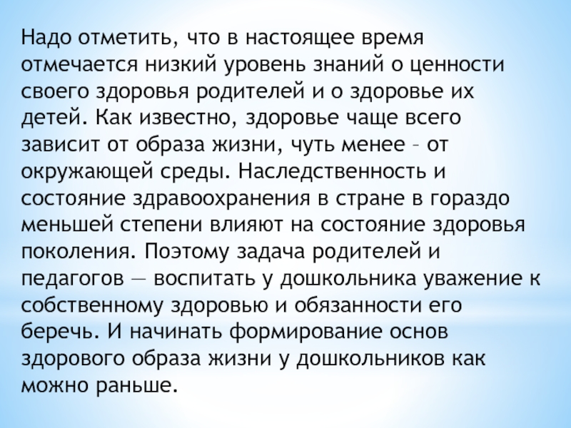 ценности своего здоровья родителей и о здоровье их детей. Как известно, здоровье чаще всего зависит от образа жизни, чуть менее – от окружающей среды. Наследственность и состояние здравоохранения в стране в гораздо меньшей степени влияют на состояние здоровья поколения. Поэтому задача родителей и педагогов — воспитать у дошкольника уважение к собственному здоровью и обязанности его беречь. И начинать формирование основ здорового образа жизни у дошкольников как можно раньше.