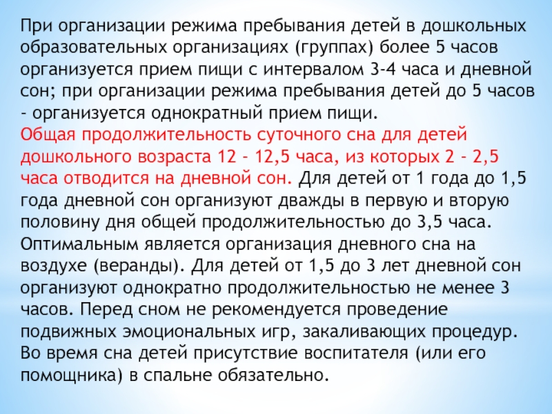 Общая продолжительность суточного сна для детей дошкольного возраста 12 - 12,5 часа, из которых 2 - 2,5 часа отводится на дневной сон. Для детей от 1 года до 1,5 года дневной сон организуют дважды в первую и вторую половину дня общей продолжительностью до 3,5 часа. Оптимальным является организация дневного сна на воздухе (веранды). Для детей от 1,5 до 3 лет дневной сон организуют однократно продолжительностью не менее 3 часов. Перед сном не рекомендуется проведение подвижных эмоциональных игр, закаливающих процедур. Во время сна детей присутствие воспитателя (или его помощника) в спальне обязательно.
