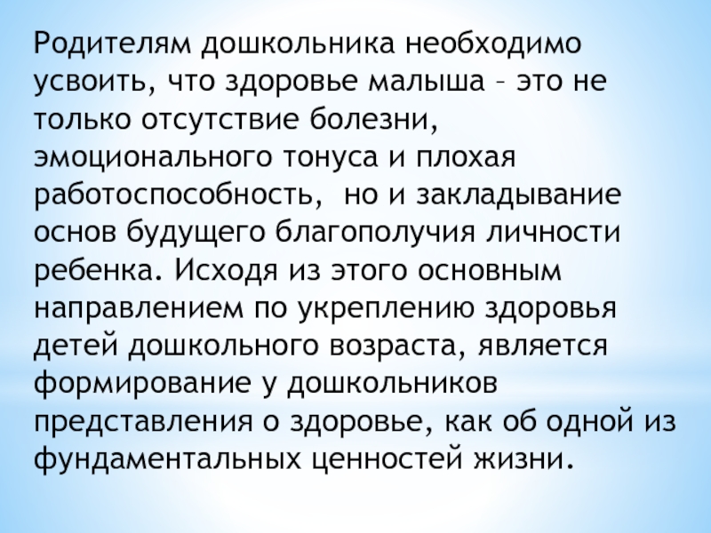 Слайд 14Родителям дошкольника необходимо усвоить, что здоровье малыша – это не только