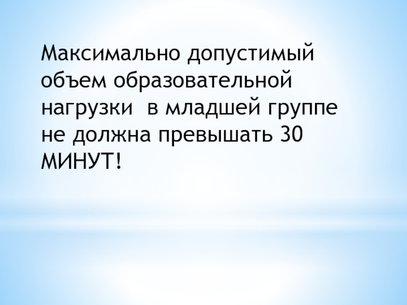 Слайд 12Максимально допустимый объем образовательной нагрузки в младшей группе не должна превышать
