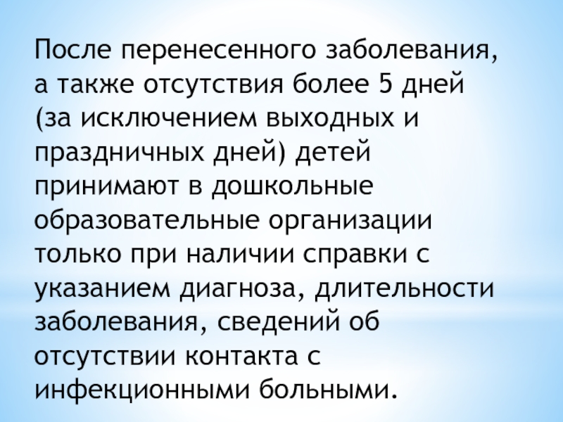 Слайд 9После перенесенного заболевания, а также отсутствия более 5 дней (за исключением