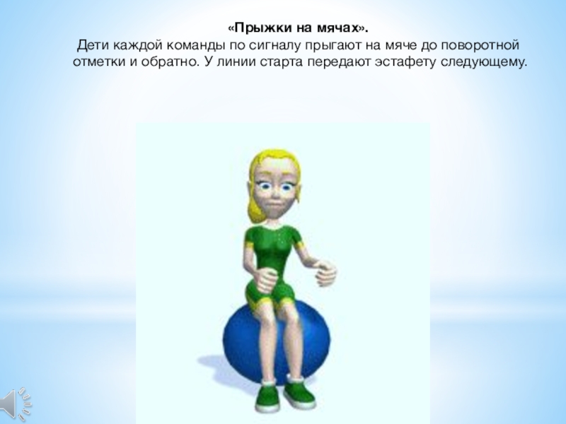 Слайд 6«Прыжки на мячах». Дети каждой команды по сигналу прыгают на мяче до