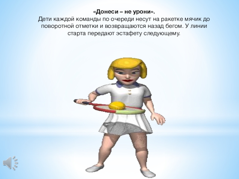 Слайд 8«Донеси – не урони». Дети каждой команды по очереди несут на ракетке