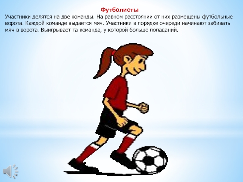 Футболисты Участники делятся на две команды. На равном расстоянии от них размещены футбольные ворота. Каждой команде выдается