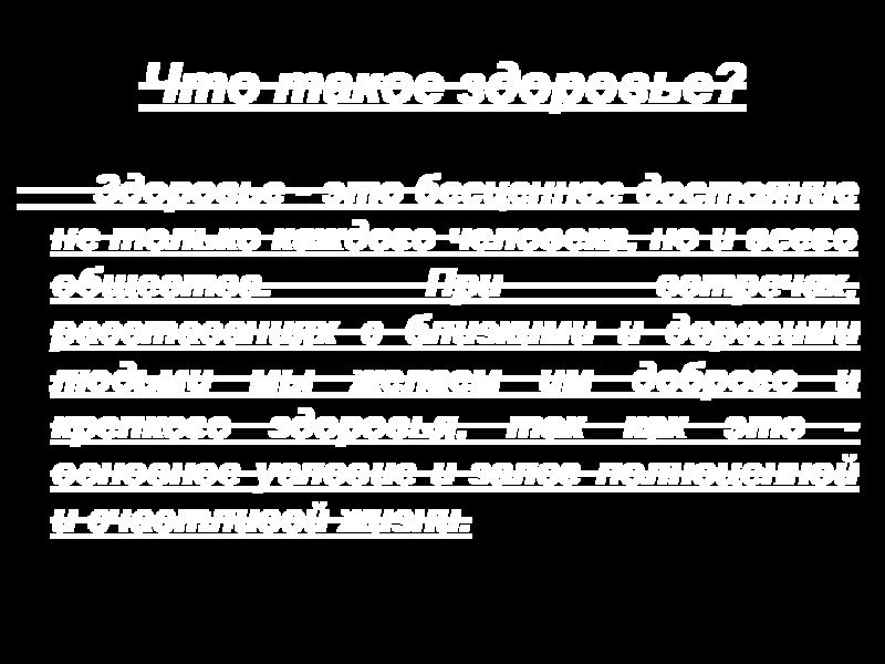 только каждого человека, но и всего общества. При встречах, расставаниях с близкими и дорогими людьми мы желаем им доброго и крепкого здоровья, так как это - основное условие и залог полноценной и счастливой жизни.