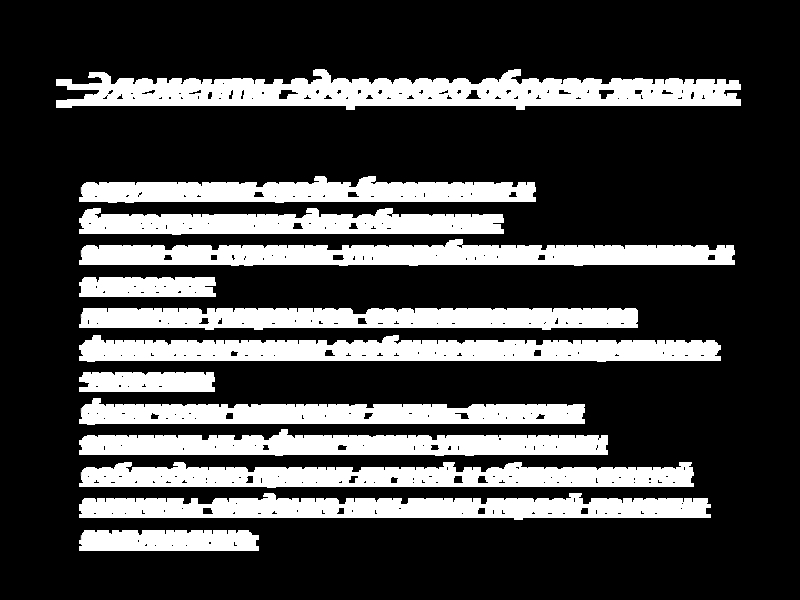 Элементы здорового образа жизни:окружающая среда: безопасная и благоприятная для обитания;отказ от курения, употребления наркотиков и