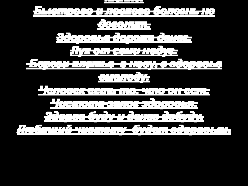 тепле. Быстрого и ловкого болезнь не догонит. Здоровье дороже денег. Лук от семи недуг. Береги платье с нову, а здоровье смолоду. Человек есть то, что он ест. Чистота-залог здоровья. Здоров буду и денег добуду. Любящий чистоту- будет здоровым.