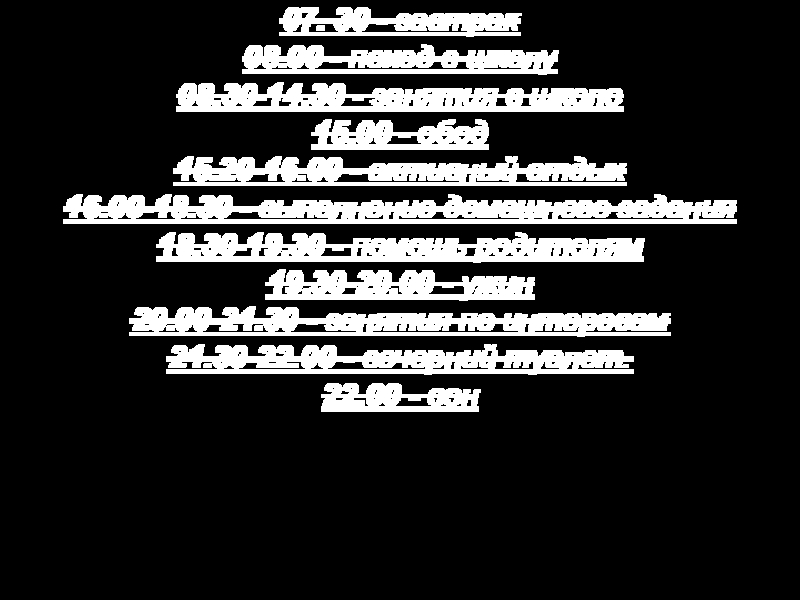- завтрак 08.00 - поход в школу 08.30-14.30 - занятия в школе 15.00 - обед 15.20-16.00 - активный отдых 16.00-18.30 - выполнение домашнего задания 18.30-19.30 - помошь родителям 19.30-20.00 - ужин 20.00-21.30 - занятия по интересам 21.30-22.00 - вечерний туалет. 22.00 - сон