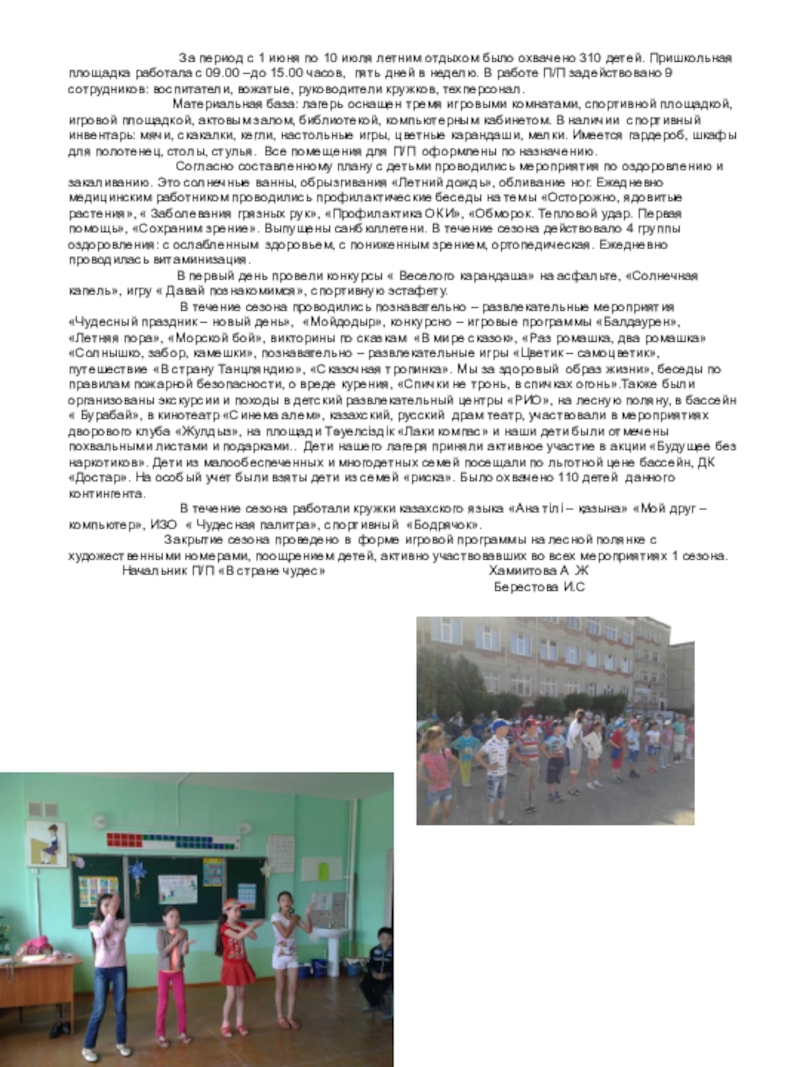 1 июня по 10 июля летним отдыхом было охвачено 310 детей. Пришкольная площадка работала с 09.00 –до 15.00 часов, пять дней в неделю. В работе П/П задействовано 9 сотрудников: воспитатели, вожатые, руководители кружков, техперсонал.