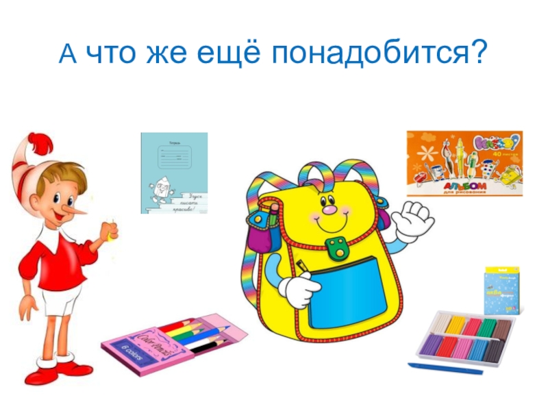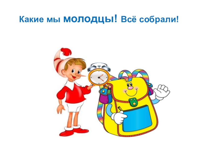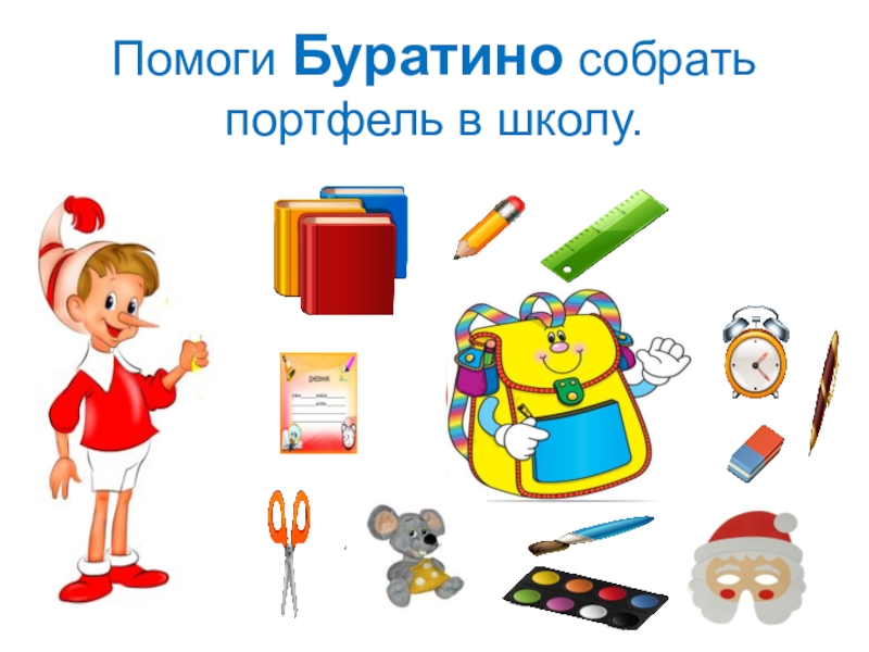 Слайд 14Помоги Буратино собрать портфель в школу.