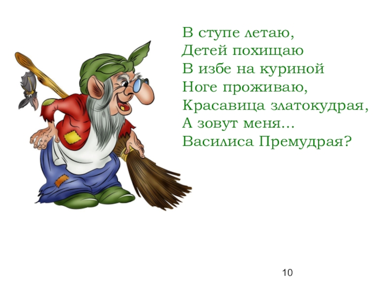 В ступе летаю,Детей похищаю В избе на куриной Ноге проживаю, Красавица златокудрая, А зовут меня... Василиса Премудрая?