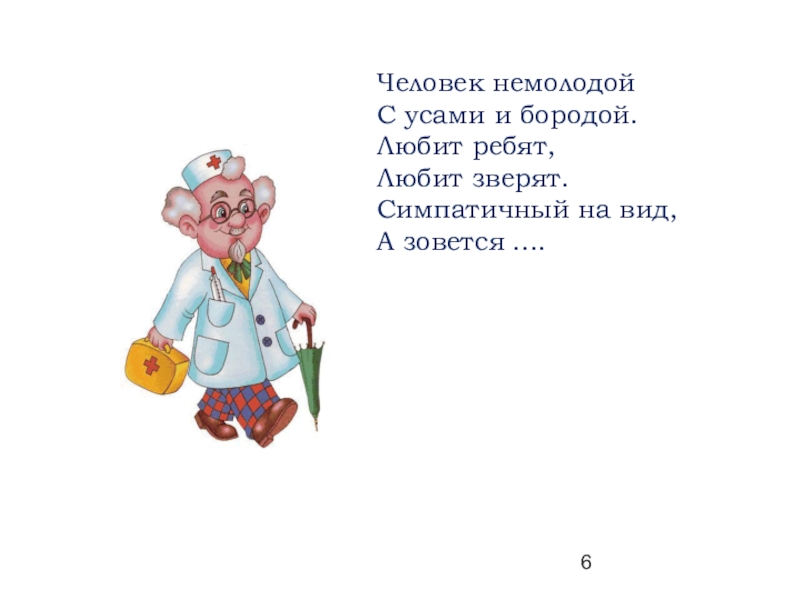 Слайд 6Человек немолодой С усами и бородой. Любит ребят, Любит зверят. Симпатичный на вид, А зовется ....