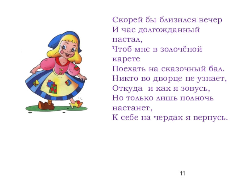 Скорей бы близился вечерИ час долгожданный настал,Чтоб мне в золочёной каретеПоехать на сказочный бал.Никто во дворце не
