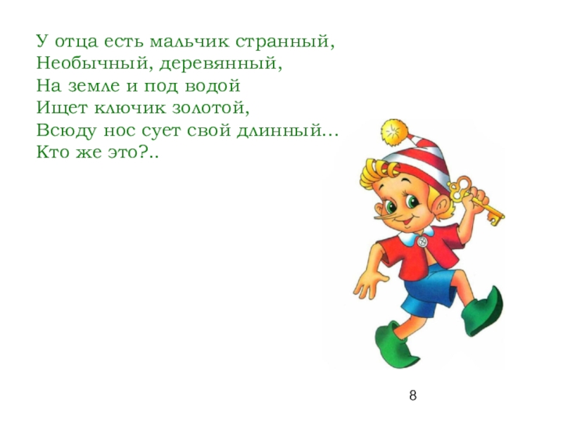 Слайд 8У отца есть мальчик странный, Необычный, деревянный, На земле и под водой Ищет ключик