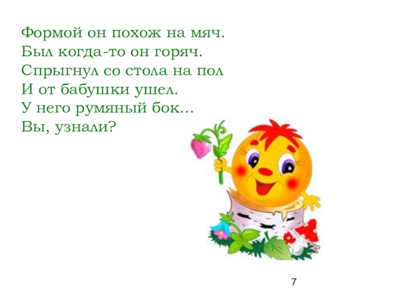 Слайд 7Формой он похож на мяч. Был когда-то он горяч. Спрыгнул со стола на