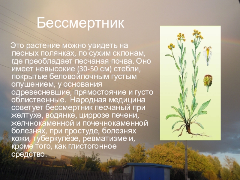 склонам, где преобладает песчаная почва. Оно имеет невысокие (30-50 см) стебли, покрытые беловойлочным густым опушением, у основания одревесневшие, прямостоячие и густо облиственные. Народная медицина советует бессмертник песчаный при желтухе, водянке, циррозе печени, желчнокаменной и почечнокаменной болезнях, при простуде, болезнях кожи, туберкулёзе, ревматизме и, кроме того, как глистогонное средство.
