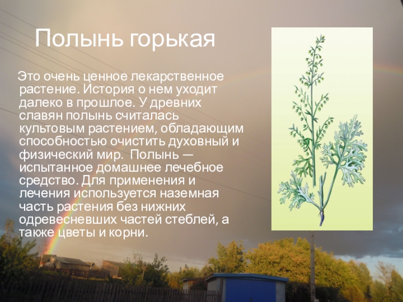 уходит далеко в прошлое. У древних славян полынь считалась культовым растением, обладающим способностью очистить духовный и физический мир. Полынь — испытанное домашнее лечебное средство. Для применения и лечения используется наземная часть растения без нижних одревесневших частей стеблей, а также цветы и корни.