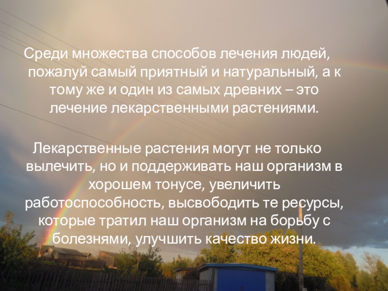 Лекарственные растения могут не только вылечить, но и поддерживать наш организм в хорошем тонусе, увеличить работоспособность, высвободить те ресурсы, которые тратил наш организм на борьбу с болезнями, улучшить качество жизни.