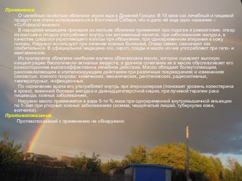 Из препаратов облепихи наиболее изучено облепиховое масло, которое содержит высокую концентрацию биологически активных веществ, а удачное сочетание их в масле обусловливает его разностороннее высокоэффективное лечебное действие. Масло обладает болеутоляющим, ранозаживляющим и эпителизирующим действием при различных повреждениях и изменениях слизистых, кожного покрова: химических, механических, рентгеновских, радиоактивных, температурных, инфекционных.
